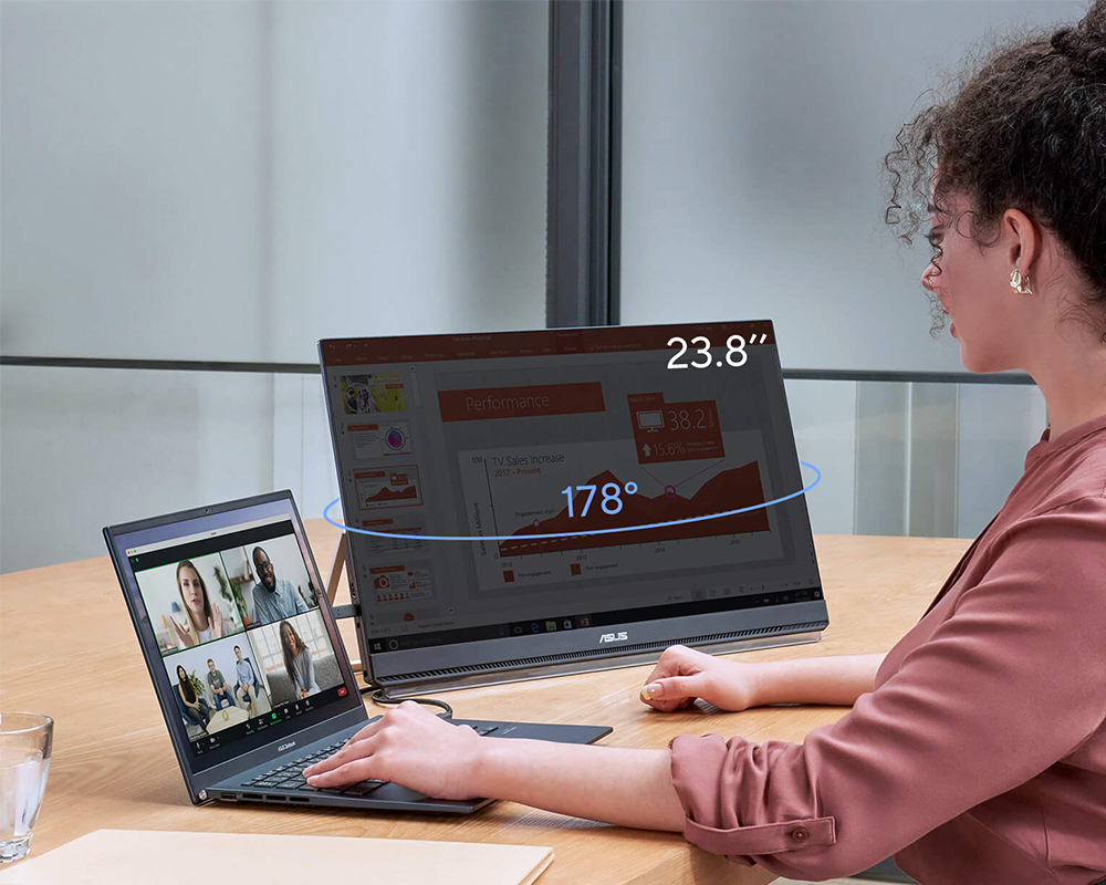 ASUS ZenScreen MB249C, 23.8 inç’lik çerçevesiz ve büyük FHD paneliyle birden fazla iş yaparken verimliliği artırmak için tasarlandı. 7,6 mm’lik şık profili ve yalnızca 2.8 kg ağırlığı, ev, ofis veya ortak çalışma alanlarında taşımayı kolaylaştırır. Ayrıca, birden fazla stant seçeneği çok yönlü kullanım sunar, böylece MB249C’yi tüm ihtiyaçlarınıza göre yapılandırabilirsiniz. Çok yönlü olması sayesinde her yeri üretim alanına çevirebilirsiniz.