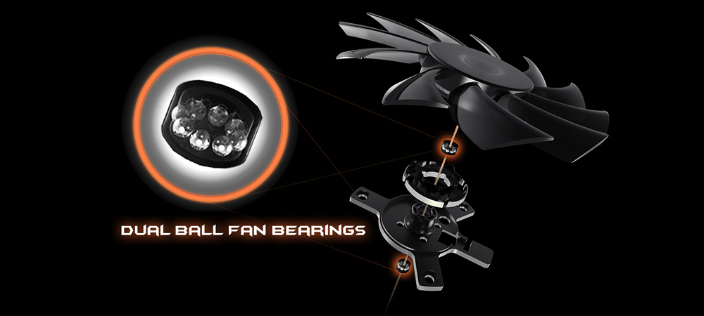 Üst seviye ROG ekran kartlarının yeni nesli için tasarlanan Eksen Teknolojili Fanlar, daha uzun kanatlara sahip olmak için daha küçük yuvalar kullanıyor ve aşağı yönlü hava basıncını artırmak için bir bariyer halkasından yararlanıyor. |