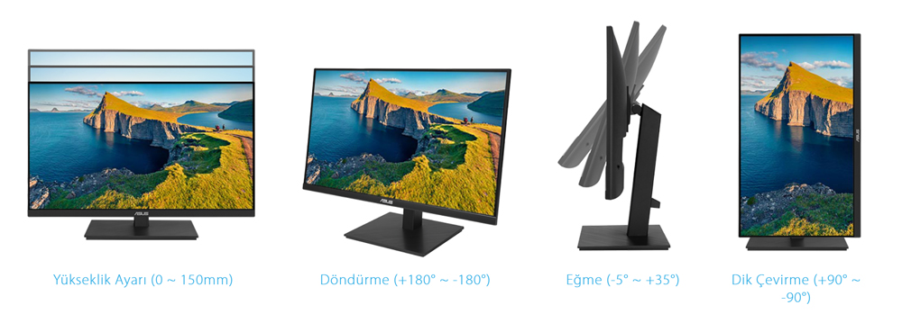 Esnek eğme, döndürme, dik çevirme ve yükseklik ayarı en rahat izleme pozisyonunu bulmayı kolaylaştırır. Ekran ayrıca Portre modunda kullanım için 90° dikey olarak döndürülebilir, bu da uzun dokümanlarla çalışırken, kod yazarken veya internet sitelerinde gezerken harika bir fayda sağlar.