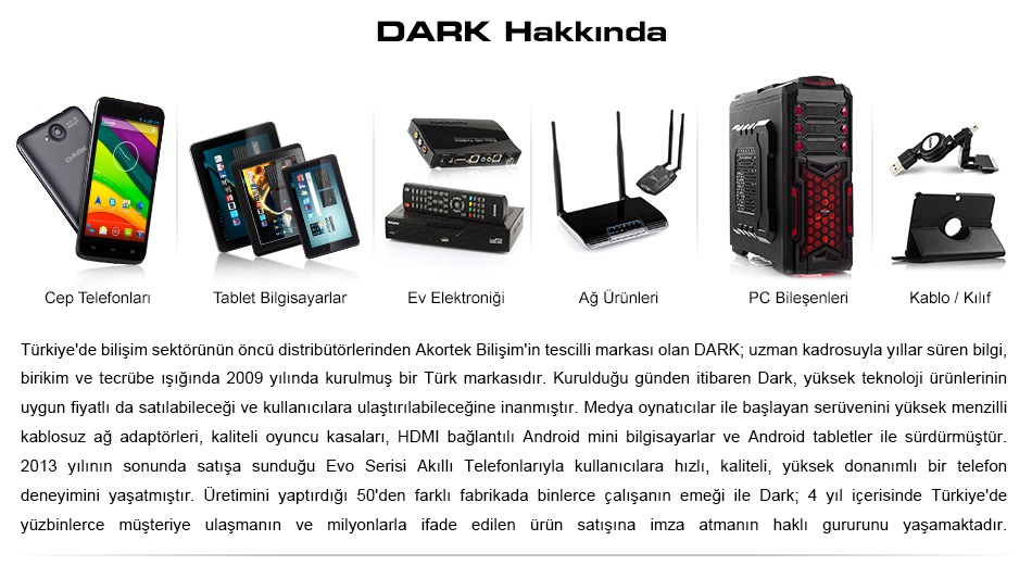Dark USB kablo, kaliteli kabloların vazgeçilmez özelliği olan "shielded" özelliğine sahiptir. Bu sayede dış elektromanyetik etmenlerden etkilenmez. Uçlar ise yüksek kaliteli ABS plastikten imal edilmiş olup sık takıp çıkarmaya karşı dayanıklıdır.