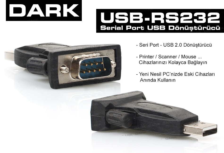 Yeni nesil seri bağlantı portu USB'yi eski nesil RS232'e çevirmek için sadece Dark dönüştürücüyü boş bir USB portuna bağlamanız yeterlidir. Ayar ya da kurulum gerektirmez. Herhangi bir sürücüye ihtiyacı yoktur.