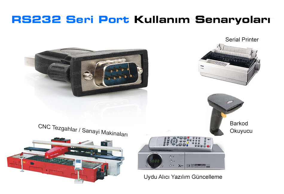 Dark, Seri (RS232) - USB dönüştürücü ile seri portu olmayan bilgisayarınızı USB bağlantı noktası üzerinden seri porta kolayca kavuşturabilirsiniz. Böylece özellikle sanayi makinelerinin arayüzleri, yazıcı, tarayıcı, barkod okuyucu gibi birçok cihazı bilgisayarınıza bağlayabilirsiniz. Dark Seri Port -USB dönüştürücü seri port destekleyen tüm cihazlar ile uyumlu çalışmaktadır.
