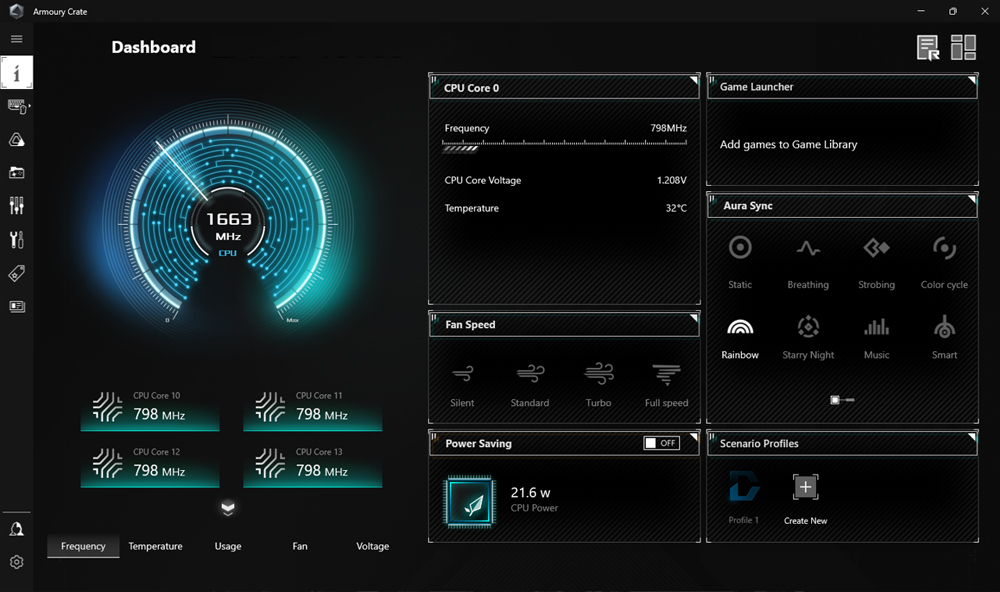 Güç Tasarrufu işlevi, güç tüketimini optimize etmek ve enerji tasarrufunu artırmak için çeşitli ayarlar barındırır. CPU güç limitini etkinleştirebilir, Aura aydınlatmayı kapatabilir ve fan profilini güç tasarrufu moduna getirebilirsiniz. Ayrıca Microsoft Windows’un barındırdığı Güç Tasarrufu planını açabilirsiniz.