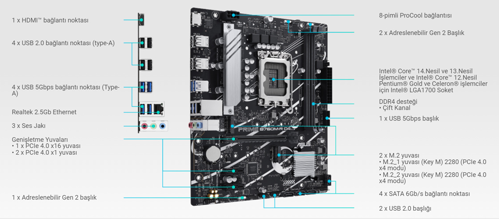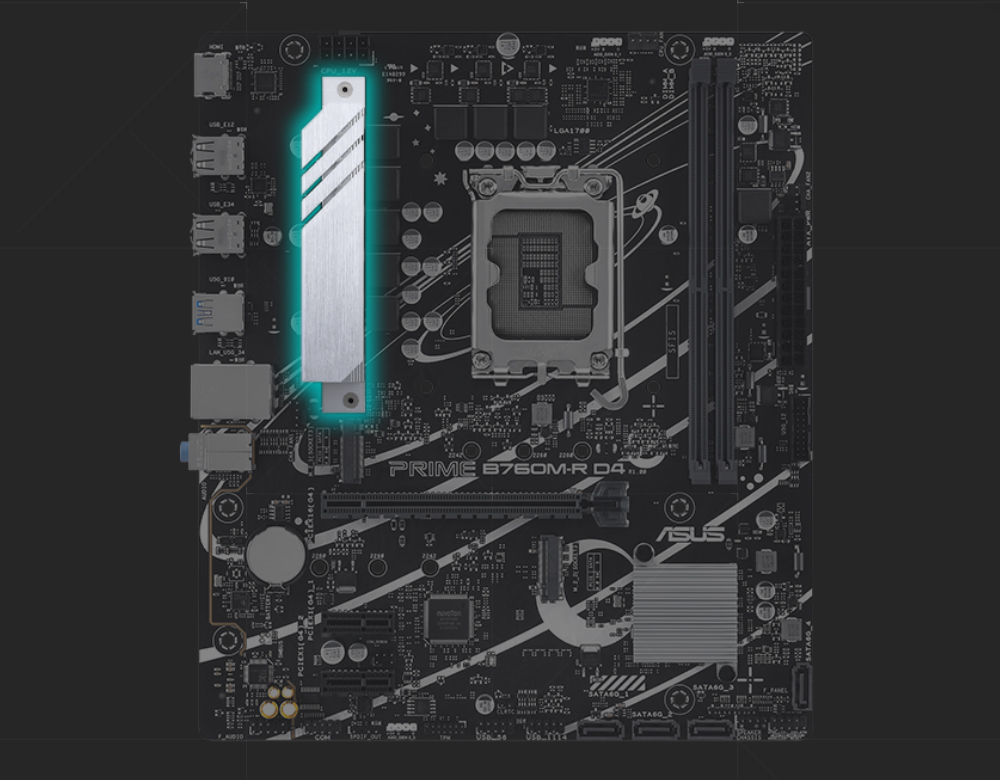 PRIME B760 anakartlar, 14, 13 ve 12.nesil Intel® işlemciler için özel olarak tasarlandı. Ek olarak, en son ekran kartları için PCIe 4.0 bağlantısına sahip.