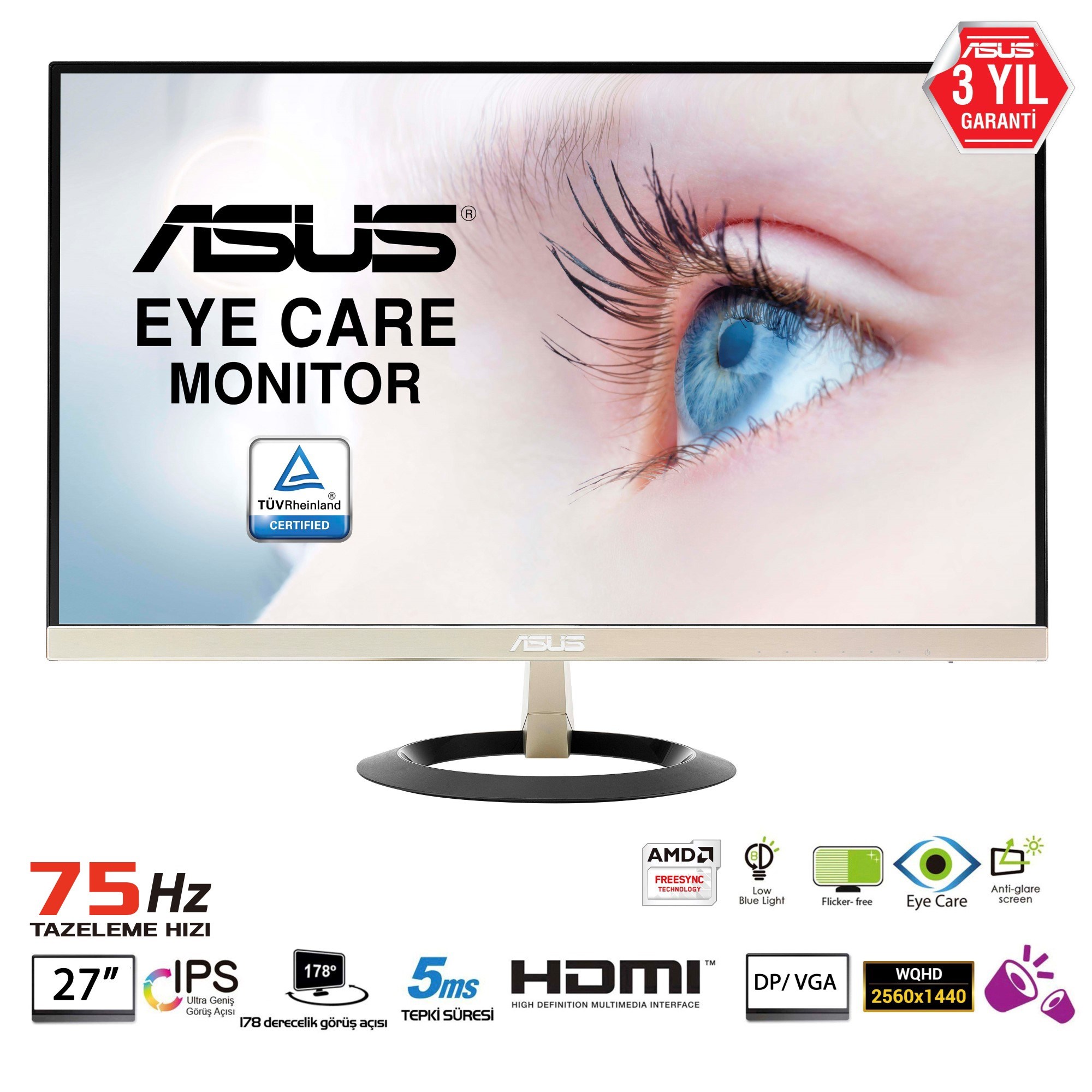 ASUS VZ27AQ FreeSync 75hz Gaming Monitör, Ultra Düşük Mavi Işık, 27" WQHD (2560x1440), IPS, Ultra ince Tasarım, Çerçevesiz, Flicker Free