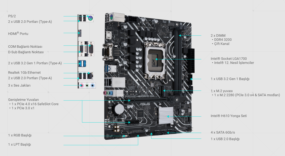 PCIe 3.0 üzerinden 32 Gbps’e kadar veri aktarımına destek veren bir M.2 yuvası sunan Prime H610M-D D4, işletim sistemi veya uygulamalar için kullanılan sürücülerde daha hızlı açılış ve yükleme süreleri elde edilmesini sağlıyor.