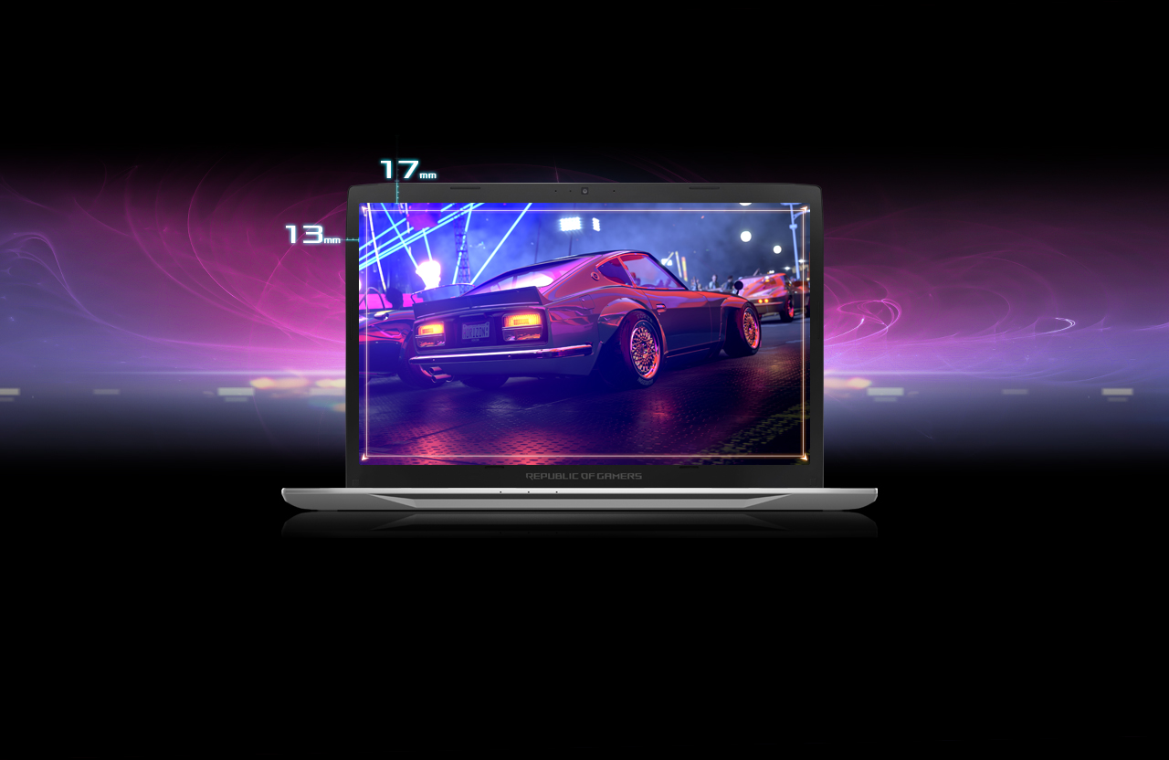 ROG Strix GL702 inceltilmiş ekran çerçevesiyle sunulur. Üst kısım 17mm, kenarlardan 13mm kalınlık ölçüleriyle göze hoş gelen, kullanımı rahat bir görüş sağlar.