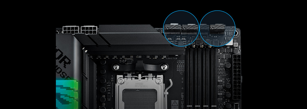 Isı borusu ile bağlanan iki adet büyük VRM soğutma bloğu, yüksek performanslı AMD Ryzen™ 9000 serisi işlemcilerin güç ihtiyacıyla başa çıkmak için geniş yüzey alanı ve kütle sağlar.