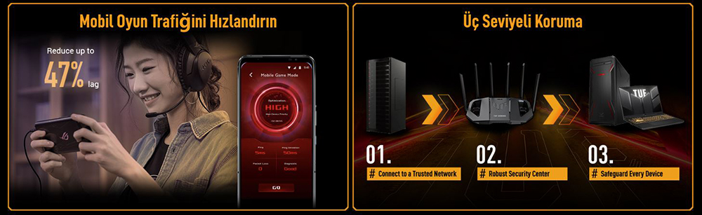 TUF Gaming BE6500, gelişmiş özelliklerle tüm ağınızı iyileştiren üç seviyeli koruma stratejisi sunar. Bu güçlü yaklaşım, gelişen siber tehditlere karşı sağlam koruma ortaya koyar.