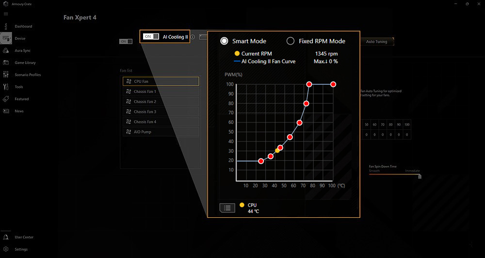 İstediğiniz sistemin soğutma performansını ve akustik özelliklerini tek tıkla dengeleyin. Özel bir ASUS algoritması, hızlı stres testi yaparken gereksiz gürültüyü ortadan kaldırır ve sonrasında CPU sıcaklığını görüntüleyerek fanları dinamik olarak en uygun hıza ayarlar.