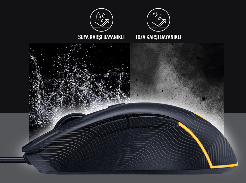 IP56 suya ve toza karşı dayanıklı koruyucu kaplama TUF Gaming M3 Gen II’yi kire ve su dökülmelerine karşı korur.
