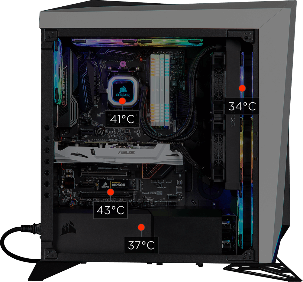Four repositionable temperature sensors allow you to accurately monitor temperatures throughout your case with CORSAIR iCUE software, as well as monitoring CPU, graphics card and motherboard temperatures. Set up custom fan curves and lighting profiles to automatically adjust fan speeds and RGB lighting as your system heats up and cools down.