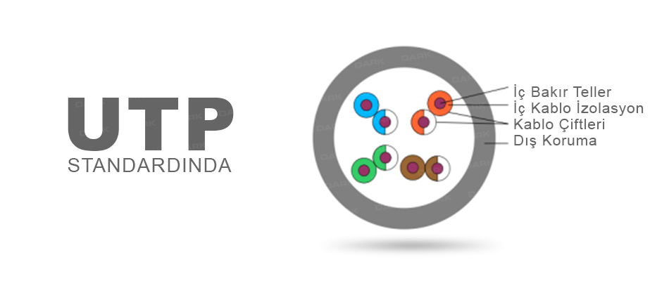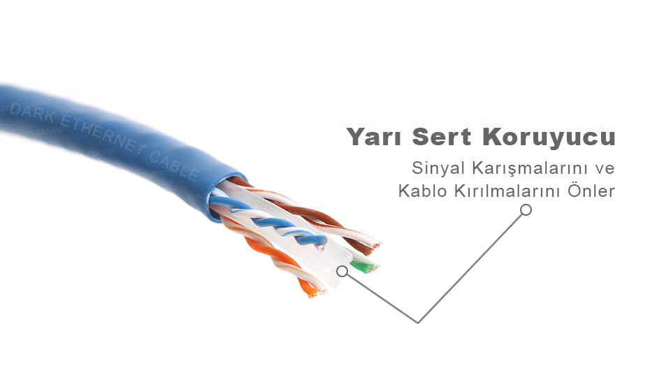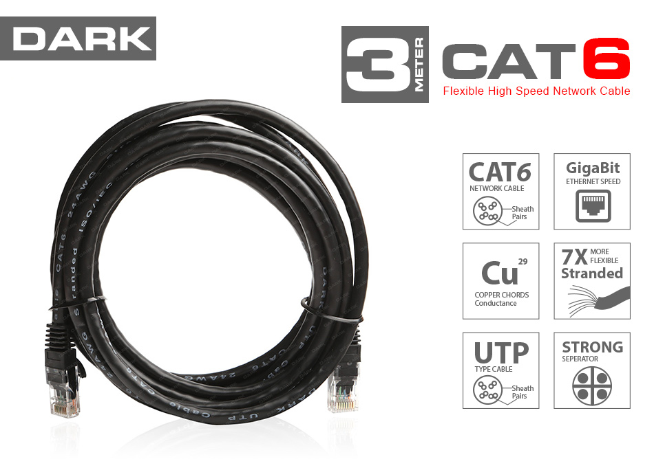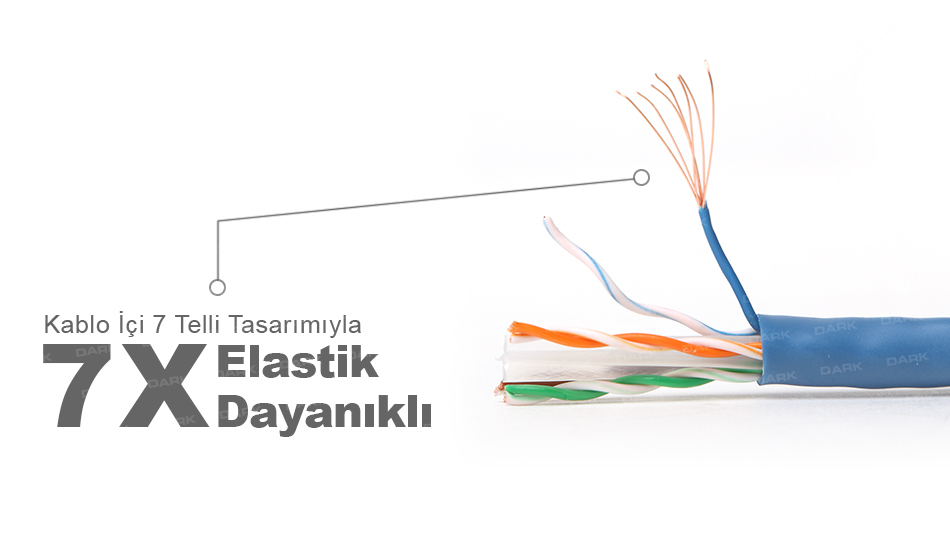 Dark UTP network kablosu, 8 damarlı ve her bir damar içerisinde 7' şer adet bakır tel kabloya sahiptir. Bu sayede Dark Patch kablosu bükülme, eğilme gibi durumlarda bile performansından ödün vermeden yüksek verimlilikte veri transferine olanak tanır. Ayrıca Dark Network kablosu, tamamen bakır tel yapısı ile yüksek iletkenliğe sahiptir.
