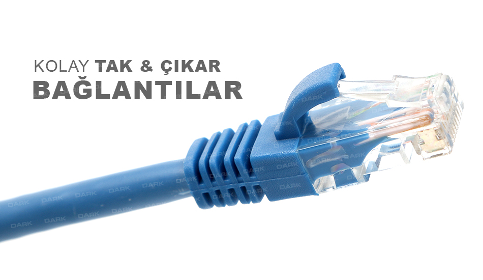 Dark Patch kablo sahip olduğu bağlantı uçları ile ağ bağlantısı yapılacak alıcı/verici jaklarına tam oturmaktadır. Ayrıca bağlantı ucu kilit koruyucusu ile tak/çıkar uygulamalarında yaşanabilecek kilit kırılmasının önüne geçilmiştir. Böylelikle hiçbir veri kaybı yaşamadan, yüksek verimlilik ve performansta verilerinizi rahatlıkla transfer edebileceksiniz. Dark Patch kablosu profesyonel Network sistem kullanıcılarının ihtiyaçları hesaplanarak, yoğun test sürecinden geçirilerek tasarlanmıştır.