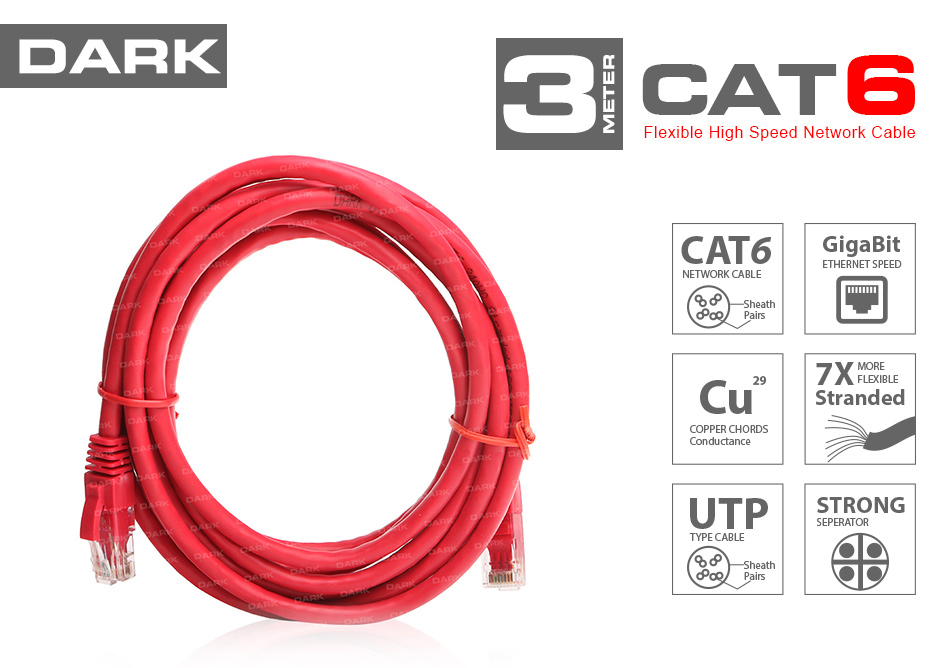 Dark DK-CB-NT6U300R Cat6 Utp 3 Mt %100 Bakır Kırmızı Patch Kablo