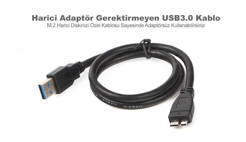 Dark M.2 SSD disk kutusu ile birlikte gelen özel microUSB3.0 kablo ile diskleriniz için yeterli güç ve hızlı veri transferi sağlanmış olur böylelikle harici adaptör taşımanıza gerek kalmaz.