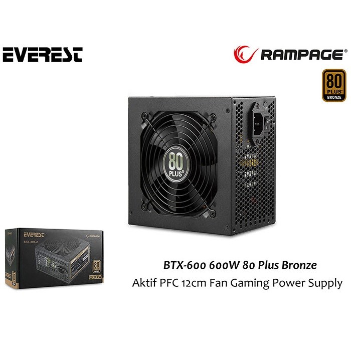 Everest Rampage BTX-600 600W 80 Plus Bronze Aktif PFC 12cm Fan Gaming Power Supply ; Kaliteli güç kaynaklarının tek adresi Rampage, yüksek güce performans ve verimlilikten ödün vermeden sahip olmak isteyen kullanıcılar için yeni nesil güç kaynağı BTX-600-2 600W'ı tasarladı. Minimum %82.6 verimliliği, Yüksek güçlü ve sessiz fanı, ekstra soğutma teknolojisi ile herşeyin mükemmelini arayan kullanıcılar için üstün kalite ve titizlikle geliştirilmiştir. Bu güçlü Powersupply 80 Plus Bronze sertifikasınasahiptir.