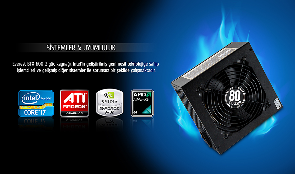 Everest Rampage BTX-600 600W 80 Plus Bronze Aktif PFC 12cm Fan Gaming Power Supply ; Intel'in geliştirilmiş yeni nesil teknolojiye sahip işlemcileri ve gelişmiş diğer sistemler ile sorunsuz bir şekilde çalışmaktadır.