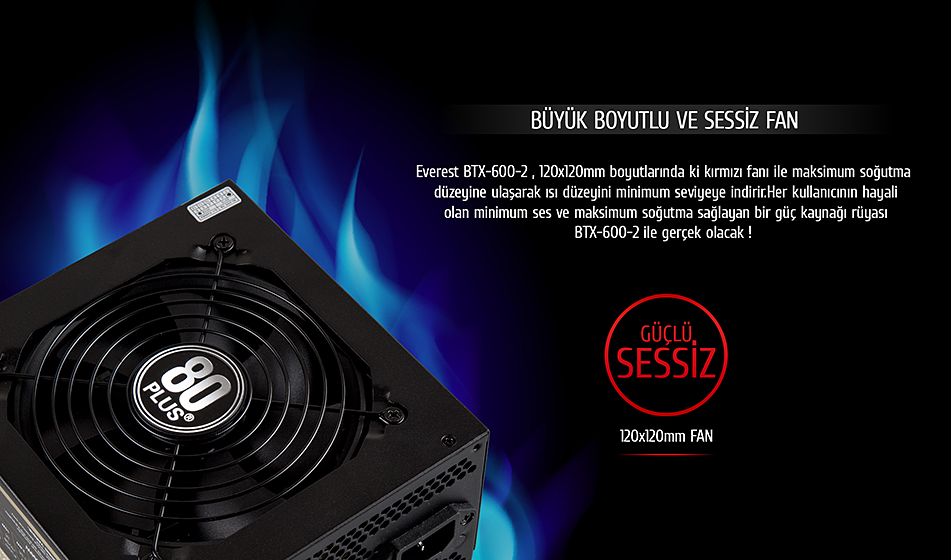Everest Rampage BTX-600 600W 80 Plus Bronze Aktif PFC 12cm Fan Gaming Power Supply ; 120X120mm boyutlarında ki fanı ile maksimum soğutma düzeyine ulaşarak ısı düzeyini minimum seviyeye indirir. Her kullanıcının hayali olan minimum ses ve maksimum soğutma sağlayan bir güç kaynağı rüyası BTX-600-2 ile gerçek olacak !