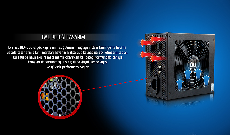 Everest Rampage BTX-600 600W 80 Plus Bronze Aktif PFC 12cm Fan Gaming Power Supply ; Güç kaynağının soğutmasını sağlayan 12cm fanın geniş hacimli yapıda tasarlanmış fan ızgaraları havanın hızlıca güç kaynağına etki etmesini sağlar. Bu sayede hava akışını maksimuma çıkarırken bal peteği formundaki tahliye kanalları ile sürtünmeyi azaltır, daha düşük ses seviyesi ve yüksek performans sağlar.