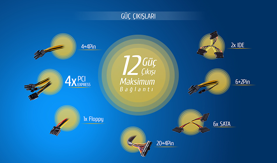 Everest Rampage BTX-600 600W 80 Plus Bronze Aktif PFC 12cm Fan Gaming Power Supply ; Tüm bileşenlerinize yetecek güç maksimum bağlantı ile emrinizde. Anakart bağlantıları 2 adet IDE, 6 adet SATA ve 4X PCI Express 6+2 Pin, 4+4 Pin, 20+4 Pin ile toplamda 12 Adet güç bağlantısı sunan BTX-600-2 kılıflı yapıdaki kabloları ile hem kasa içi dağınıklığı önler hemde kasa soğutmasına katkıda bulunur.