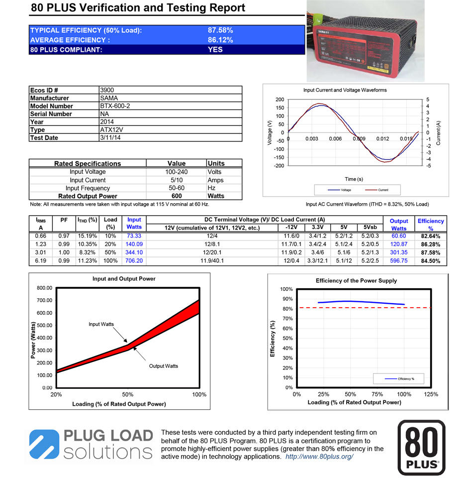 Everest Rampage BTX-600 600W 80 Plus Bronze Aktif PFC 12cm Fan Gaming Power Supply ; Sama firmasının fabrikalarında üretilmiştir. Plug Load Solutions kurumu tarafından yapılan testler sonucunda minimum %82.6 verimlilik sonucu ile 80 Plus Bronze sertifikasına layık görülmüştür. Test sonuçlarına ulaşmak için lütfen ziyaret ediniz