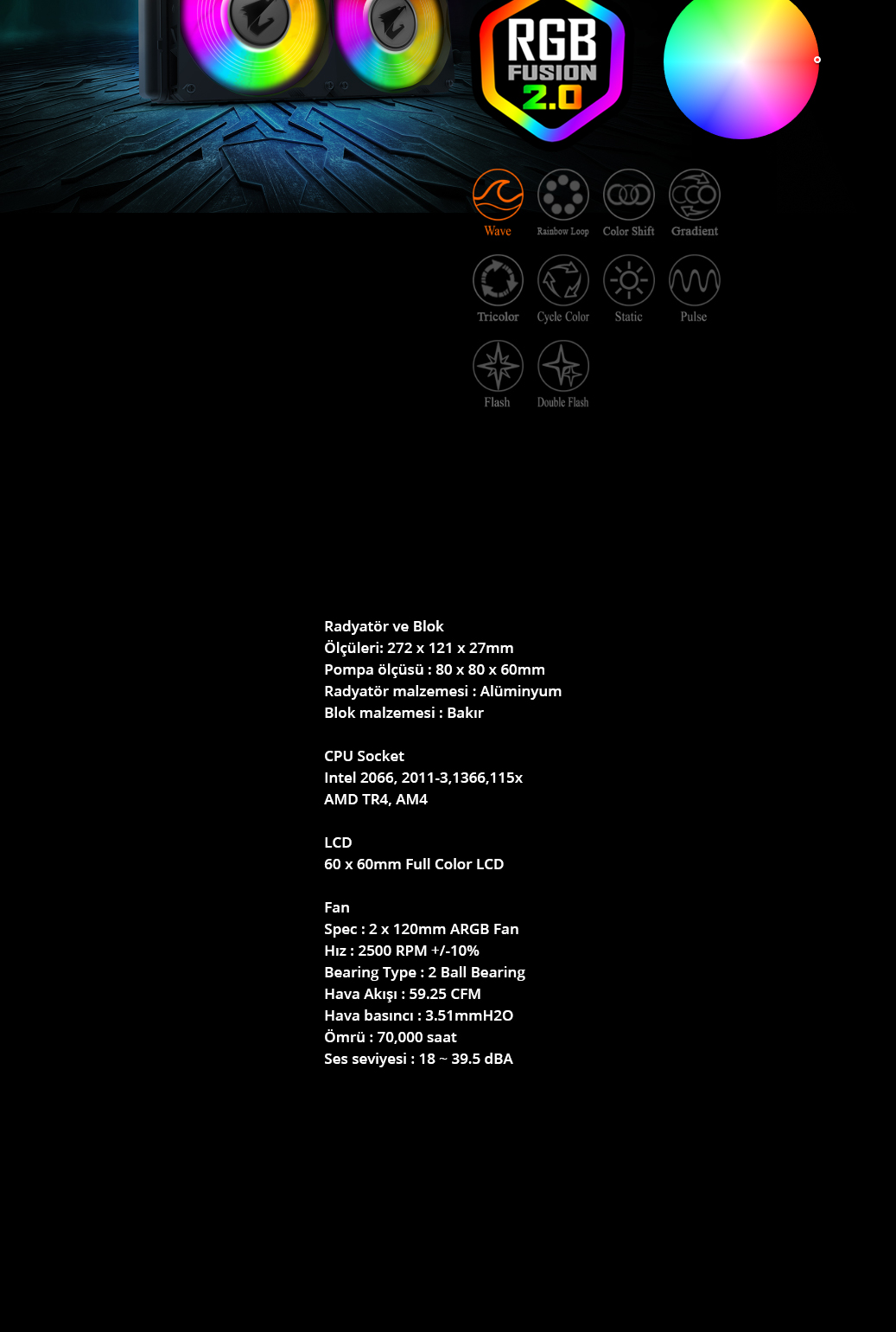 | Fan Boyutu | Pompa: 80 x 80 x 60 mm ,Radyatör: 272 x 121 x 27mm |