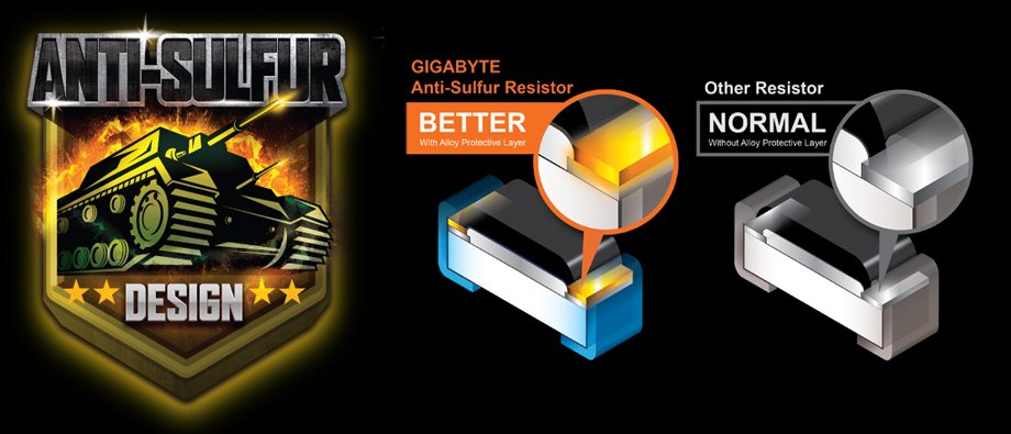 Havadaki kükürt bileşikleri kimyasal onarım yapan küçük dirençlere nüfuz edebilir ve bu dirençlerin açılıp kısalmasına neden olabilir. Bunlardan herhangi biri gerçekleşirse anakart çalışmaz hale gelir. Dirençleri Anti-Kükürt Tasarımıyla donatarak GIGABYTE Ultra Dayanıklı Anakartlara yepyeni bir anlam kazandırdık.