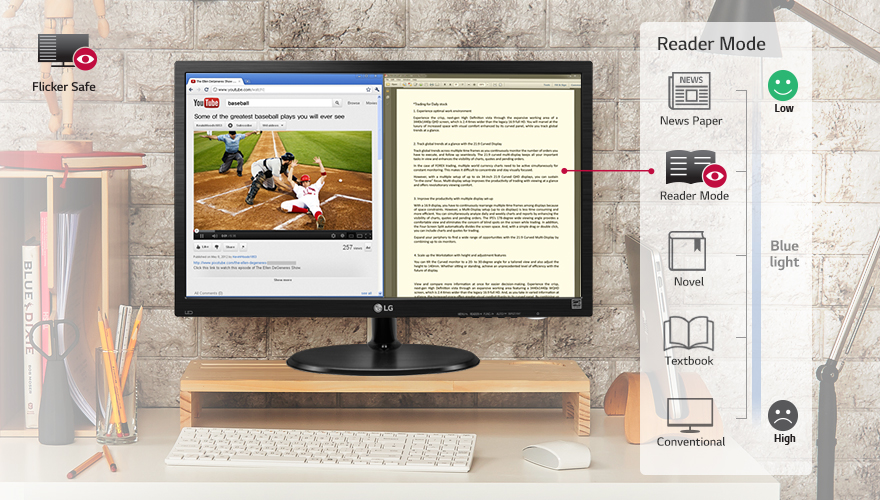 Flicker Güvenli teknolojisi göz yorgunluğuna neden titreme seviyesini en aza indirmek için uygulanır. Daha az göz yorgunluğu için yeni karartma teknolojisi ile neredeyse sıfır titreme özelliği sayesinde, ekran önünde daha rahat zaman geçirmek mümkün olacak.