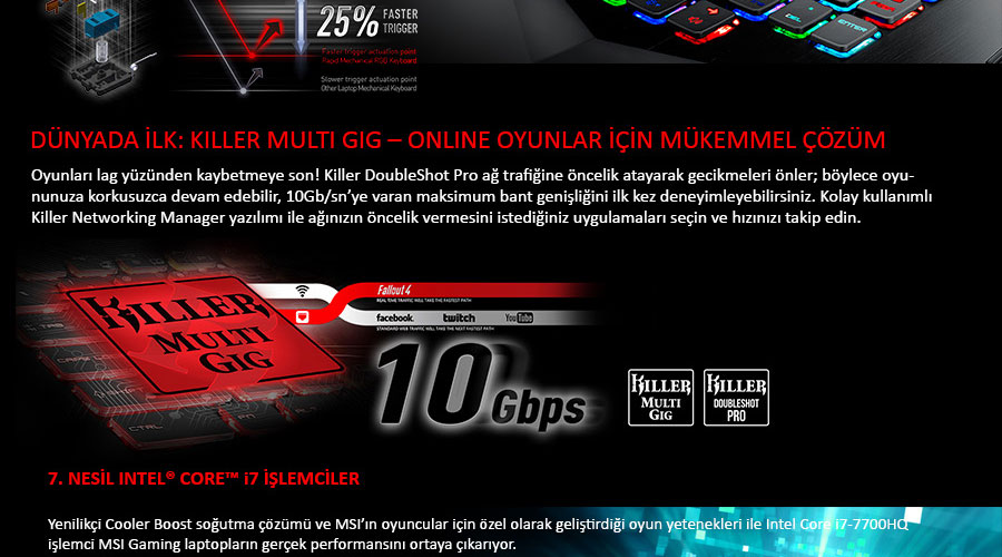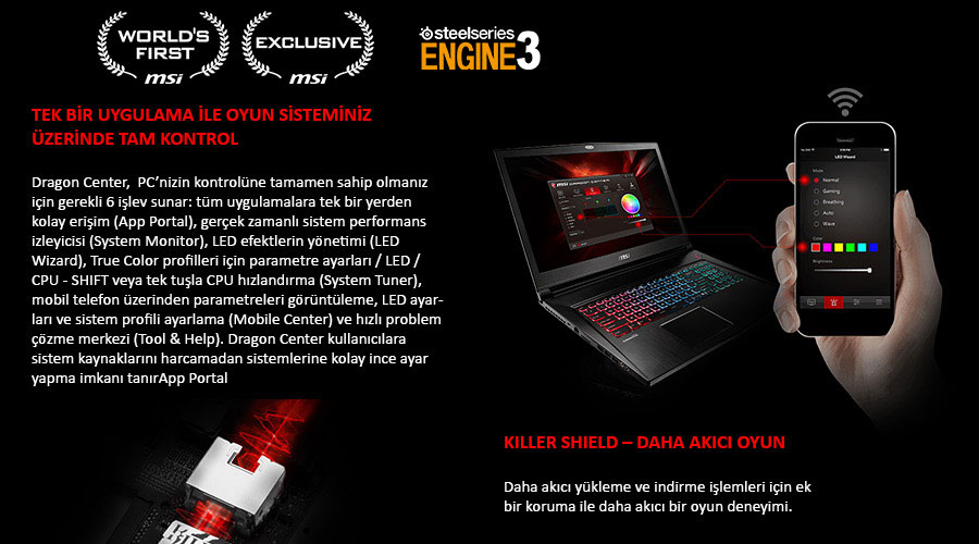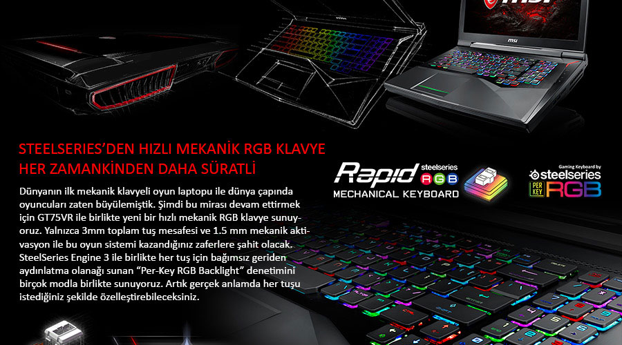 Halihazırda ilk mekanik klavye oyun bilgisayarı ünvanını elinde barındıran MSI, bu modelde daha hızlı RGB klavye ile müşterilerinin karşısına çıkıyor. 3 mm tuş mesafesi ve 1.5 mm mekanik aktivasyon değerleri ile klavye kullanımında yeni bir dönem açıyor. Böylece oyun oynarken daha hızlı ve etkili bir şekilde klavyeden yanıt almak kolaylaşıyor. SteelSeries Engine 3 teknolojisi ile bağımsız aydınlatma seçeneği yer alıyor. Ayrıca her tuş ayrı olarak özelleştirilebiliyor.