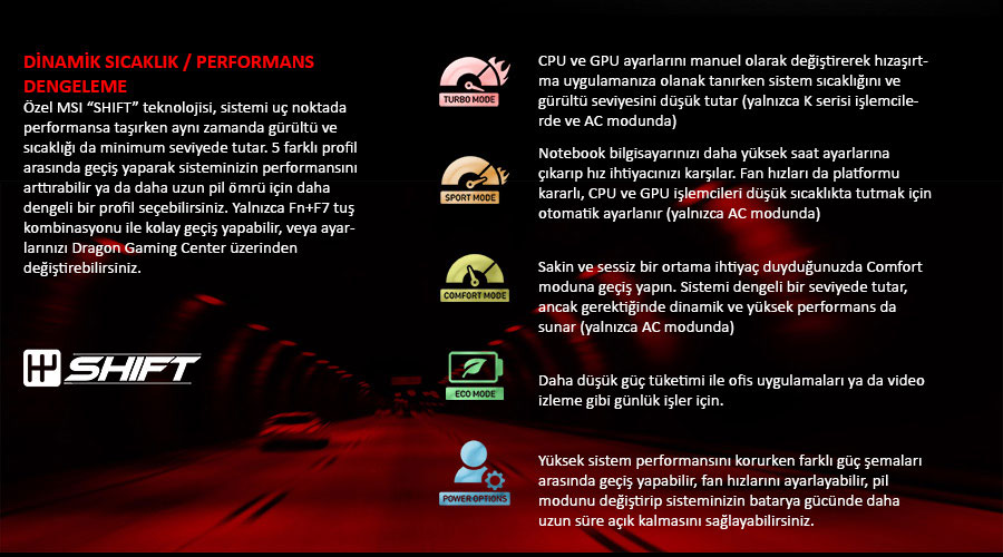MSI SHIFT teknolojisi ile beraber sisteme mümkün olan en fazla gücü verirken, fazla hızın yarattığı gürültü ve sıcaklığı ise daha düşük değerlerde ayarlıyor. Değiştirilebilen 5 farklı profil seçeneği sunuyor. Bu seçenekler; Turbo, Sport, Comfort ve Eco olarak kullanılabiliyor.
