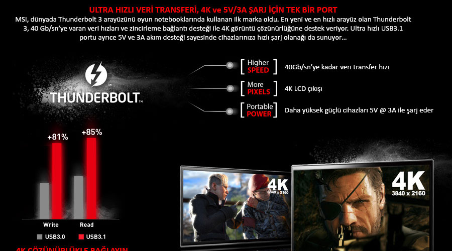 40GB/SN kadar ulaşabilen veri hızı ve 4K görüntü çözünürlüğü sağlayan portlar ile artık kalite ve hız kaybı yaşamdan aktarımlar yapabilirsiniz. USB 3.1 destekli portlar ile akıllı cihazlarınıza yüksek hızlarda şarj olanağı da sağlayabilirsiniz.