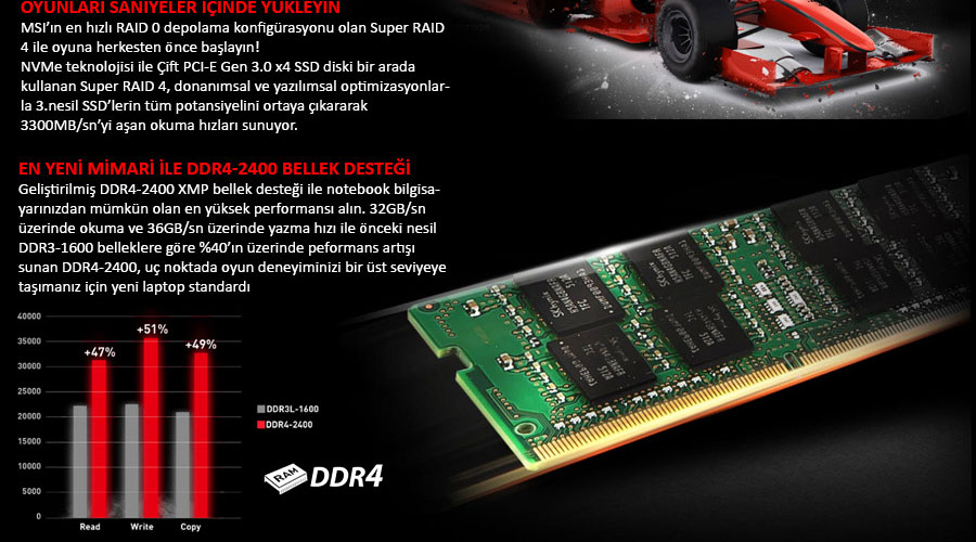 Gelişmiş DDR4-2400 XMP ile dizüstü bilgisayarınızdan en yüksek olan performansı alabilmek mümkün oluyor. 32GB/SN okuma 36 GB/SN yazma hızları ile beraber oyun deneyiminizi daha üst seviyelerde yaşamak kolaylaşıyor. Ayrıca çoklu işlem gerektiren uygulamalarda da gecikme yaşamadan işlerinizi tamamlayabilirsiniz.