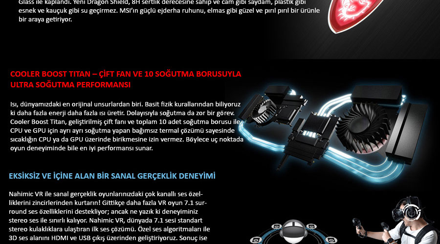 Oyun bilgisayarları çok yüksek özelliklere sahip konumda bulunuyor. İnanılmaz grafik görüntüleri sağlayabiliyorlar. Fakat temel fizik kuralı olan daha fazla enerji daha fazla ısı üretir mantığından yola çıkarak bu bilgisayarlarda soğutma birimi çok önemli bir yerde duruyor. MSI geliştirdiği Cooler Boost Titan ile beraber bu sorunu çözmeyi amaçlıyor. Modelde yer alan çift fan ve on adet soğutma borusu, hem işlemci hem de grafik birimi için ayrı soğutma sağlıyor. Yine bu soğutma sayesinde hem GPU hem de CPU üzerinde ısı birikmesi olmuyor. Böylece en iyi oyunları bile oynarken, hem performans hem de verimlilikten ayrılmadan zevkli bir deneyim yaşayabilirsiniz.