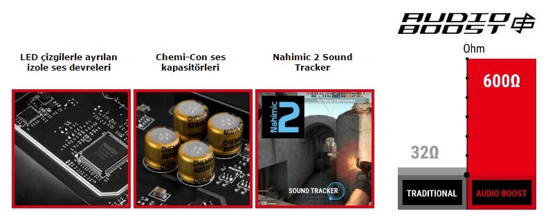 Tıpkı harici bir ses kartı gibi, Audio Boost 4 üzerinde bir HD ses işlemcisi, adanmış bir amplifikatör ve yüksek kaliteli ses kapasitörleri bulunuyor. Bu bileşenlerin tamamı anakartın diğer devrelerinden fiziksel olarak izole edildiği için mümkün olan en saf ses sinyali ile rakiplerinizi elinizle koymuş gibi bulabilirsiniz.