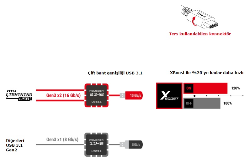 Favori oyunlarınızı, müzik ve videolarınızı USB üzerinden artık çok daha hızlı aktarabileceksiniz. MSI, USB3.1 cihazlarınızı bağlamak ve yıldırım hızına ulaştırmak için birçok çözüm sunuyor!