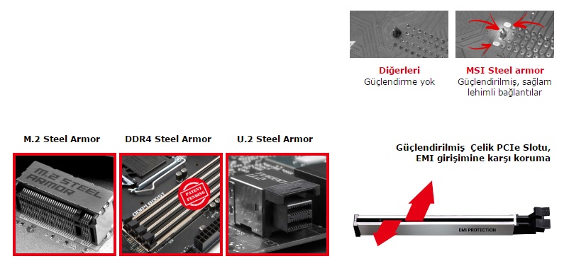 Gelecek nesil SSD’ler, gelecek nesil bağlantı noktalarına ihtiyaç duyuyor. MSI GAMING anakartta bulunan ve cihaz başına 32Gb/sn’ye varan bir hız sunan U.2 konnektörü ayrıca geliştirilmiş koruma için Steel Armor ile birlikte.