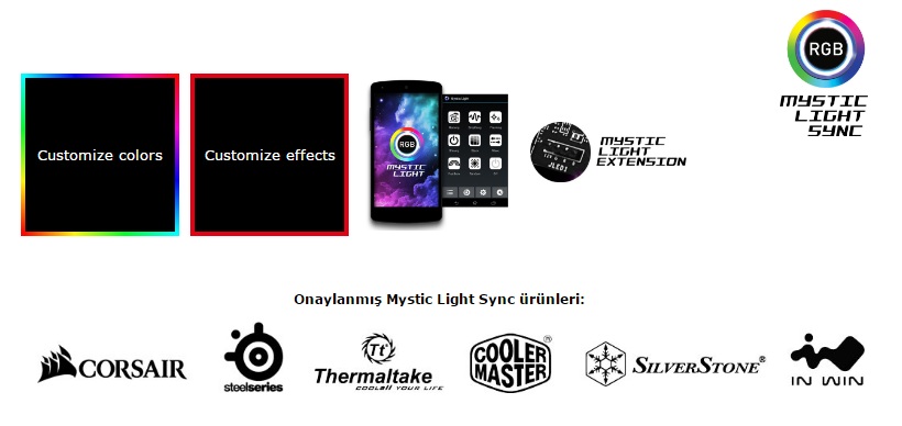 Harici RGB şeritler ekleyin ve diğer RGB uyumlu cihazlarla tek bir program kullanarak eşitleyin: Mystic Light Sync. MSI Gaming App veya akıllı telefonunuzu kullanarak paletten istediğniniz renkleri seçerek sisteminizin tarzına uyumlandırın. Farklı renkler mi istiyorsunuz? Sisteminizin görünümünü 1 saniyede değiştirin!