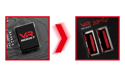 Geleneksel USB portları sinyal düşmesi sebebiyle bağlı cihazlarda performans kaybına yol açabilir. Yalnızca MSI’da bulunan VR Boost, sanal gerçeklik uygulamaları için optimize edilmiş USB portuna temiz ve güçlü bir sinyal gönderen akıllı bir yongadır. Böylece VR deneyiminizden her zaman aynı keyfi alabilirsiniz.