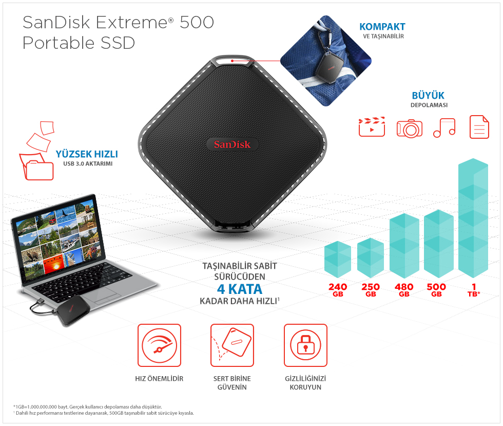 Katı hal teknolojisi, çok sayıda medya dosyaları çeken ve taşıyan fotoğraf ve video profesyonellerine güvenilir, duyarlı ve yüksek performanslı depolama sunar. Emeğinize önem veriyorsanız, o zaman taşınabilir depolama sürücünüzün SanDisk Extreme 500 olmasında fayda var.