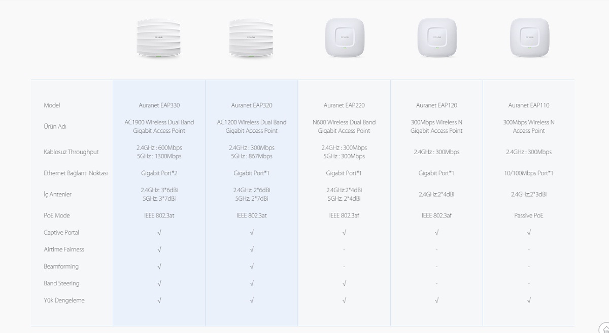 | Paket İçeriği | AC1900 Kablosuz Dual Band Gigabit Erişim Noktası EAP330 Güç Adaptörü Montajlama kitleri Kurulum Kılavuzu |