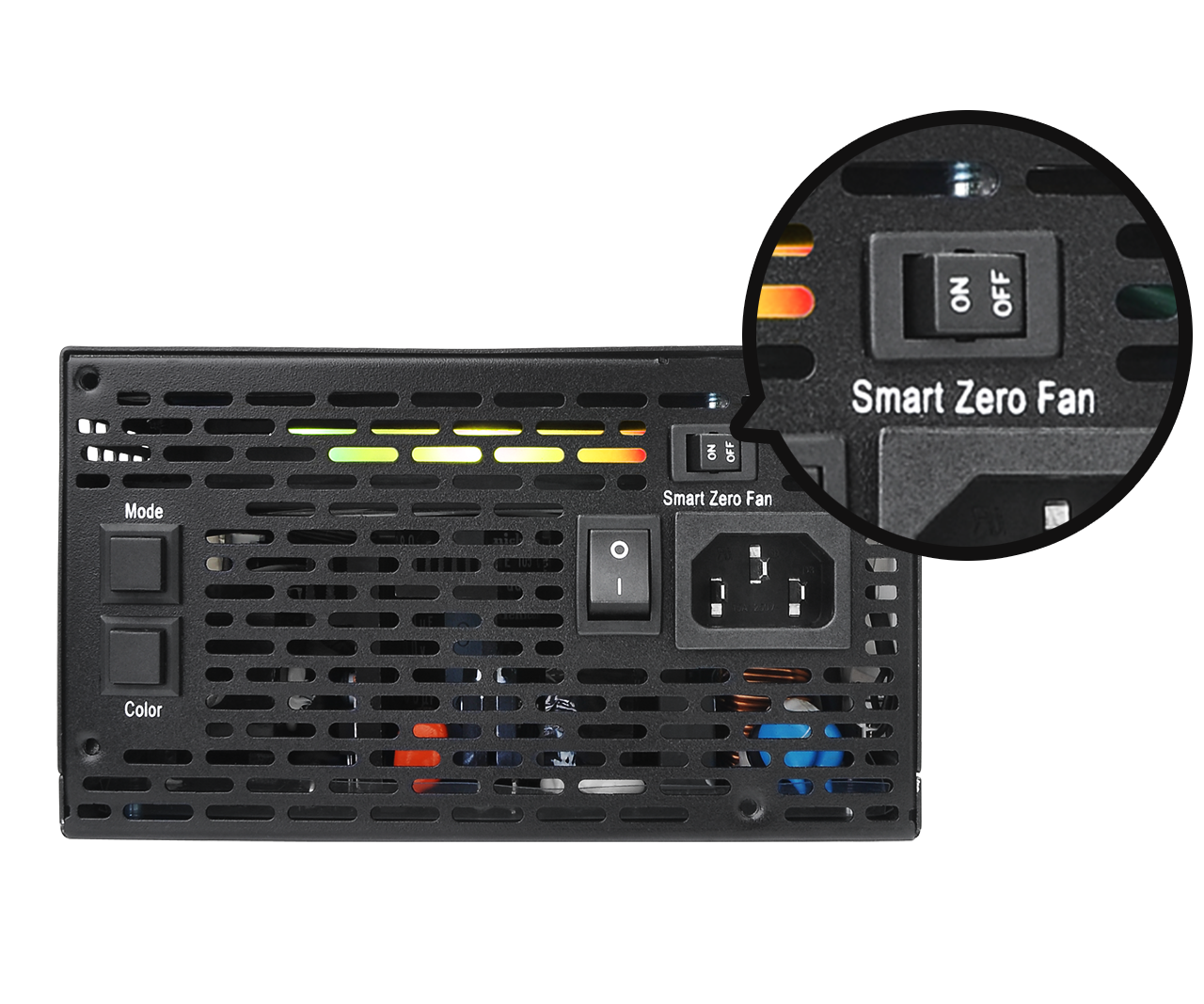 Güç kaynağı çalışma yükü% 40'ın üzerine çıktığında Akıllı Sıfır Fan çalışmaya başladığında, istenmeyen gürültü en aza inecektir. Fanın sürekli dönmesini tercih edenler için arka panelde kullanıcı dostu bir anahtar bulunur.