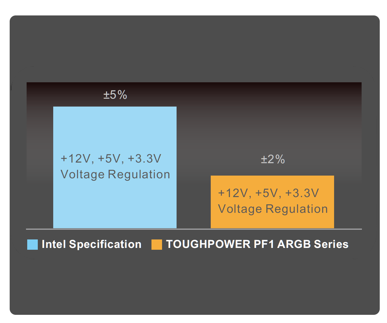 Büyük raylar için Intel'in standart ±% 5'inden ve -12V için ±% 10'dan daha katı olan voltaj regülasyonu, büyük rayların en yüksek performansı karşılaması için ±% 2'den fazla olmayacak şekilde ayarlanmıştır.
