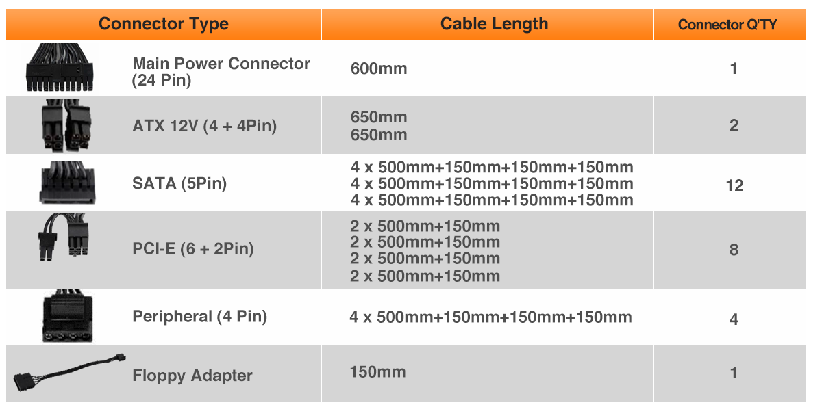 Seri, sistemi avantajlı bir voltajda çalıştırırken kullanıcılar için kablo seçimi sunar. Düşük profilli düz siyah kablolar, kablo yönetimini kolaylaştırır, dağınıklığı azaltır ve şasi içindeki hava akışını artırır.
